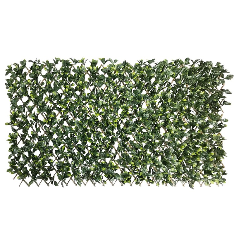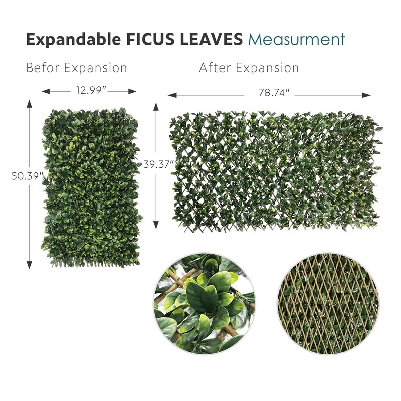 - LOOKS LIKE REAL: The artificial foliage looks like real. Trellis is made of 100% real, natural wood. The leaves are made of 100% PURE non-recycled polyethylene materials, finished with commercial standard UV stabilization. When fully expanded measurements are: 18" H x 116" L. When completely condensed (not expanded) measurements are: 48" H x 18" L. Flexible, expands, or contracts to your desired dimensions and privacy that best fits your needs