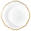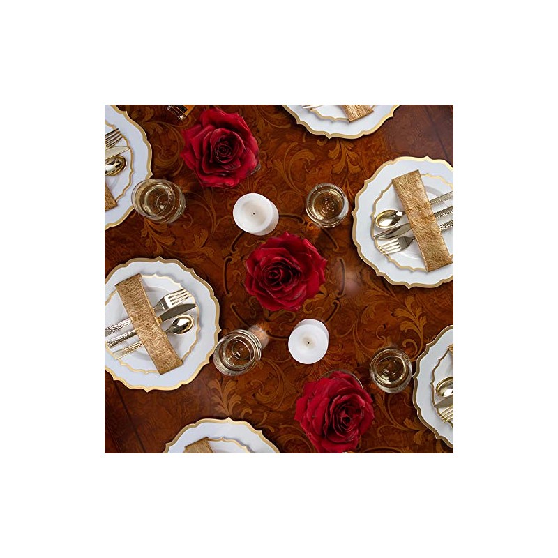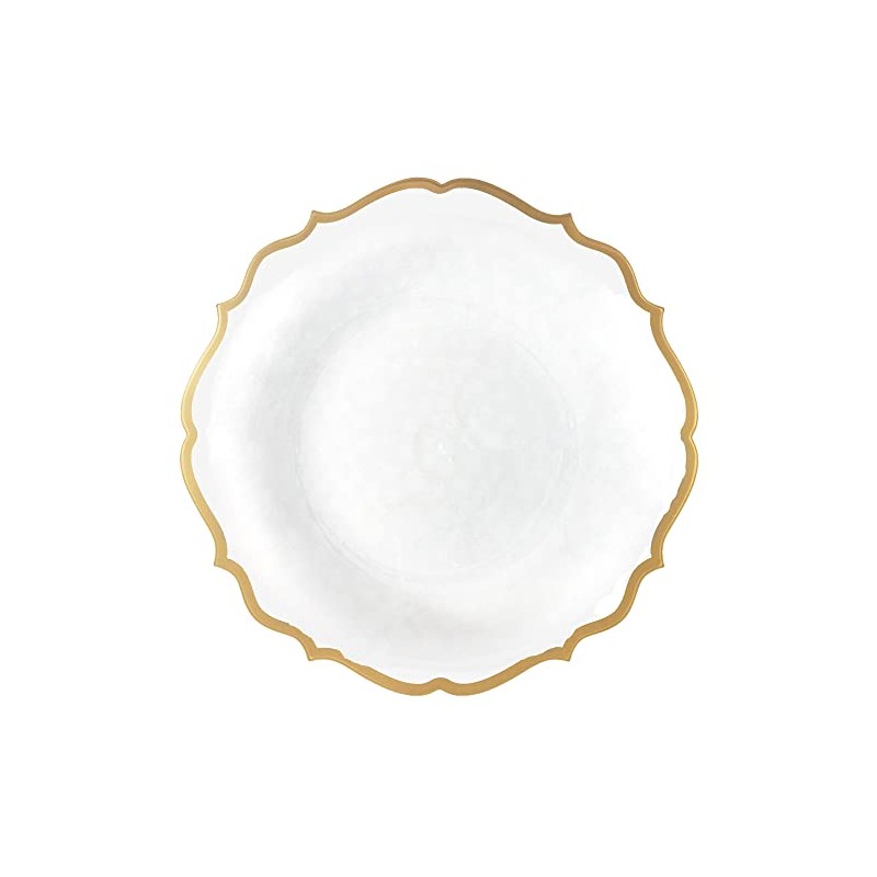 - WHITE PLATES WITH GOLD RIM: Whether it's an at home party or corporate event, these white round plastic plates with gold rim modern design will add to your decor and your table setting. With their beautiful white and gold color modern design they are sure to be a hit! These plates pair great with our 6-inch, 7.5-inch and 9-inch plates of the same style! Setup your next dinner table in a breeze with style!