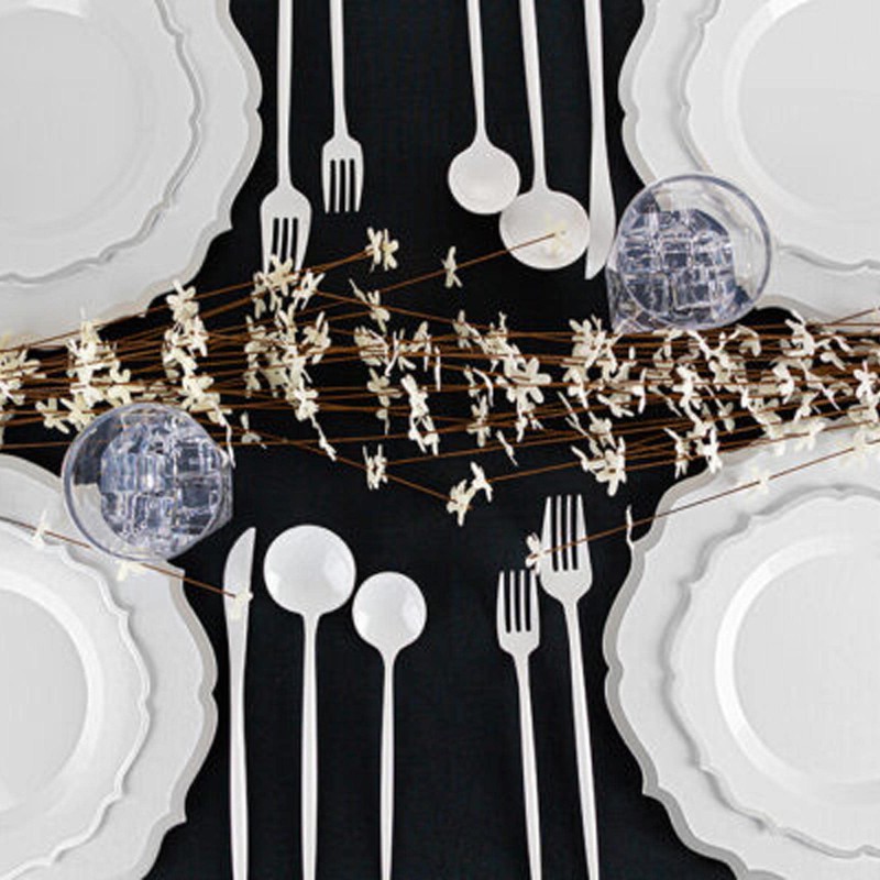 - MESS FREE CLEAN UP: These white with silver rim contemporary design plastic plates will make any catering event or dinner fabulous. Save yourself the time dishwashing and cleaning up with our easily reusable and disposable plates. Sturdy enough to serve your favorite treats. Just toss your plates when you're done with no clean up necessary. EcoQuality encourages everyone to reuse and recycle.