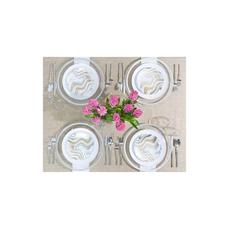 - MESS FREE CLEAN UP: These white plates with gold and silver curve design plastic plates will make any catering event or dinner fabulous. Save yourself the time dishwashing and cleaning up with our easily reusable and disposable plates. Sturdy enough to serve your favorite treats. Just toss your plates when you're done with no clean up necessary. EcoQuality encourages everyone to reuse and recycle.
