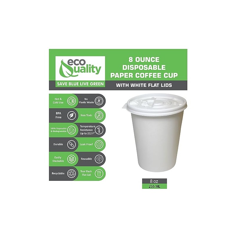 - CONVENIENCE: Our white 8oz coffee cups with rolled rims are made for comfortable drinking. EcoQuality disposable paper cups with lids can be used with any hot or cold drinks and make great for serving coffee, tea, espresso and hot chocolate. Disposable hot paper cups can then be thrown directly into your recycling bin after each use-saving time and cleaning!
