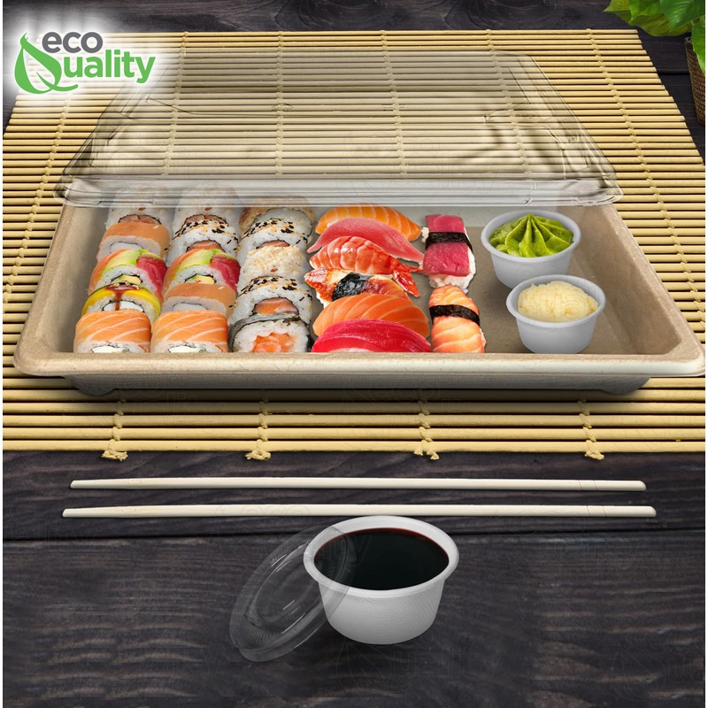• FOOD SAFE: Our EcoQuality unbleached, microwave safe ecofriendly compostable disposable sushi trays with lidsare great for many uses from Hot and Cold Foods to Solids and Liquids. These trays are oil resistant and contain no artificial coating. Serve your favorite sushi and meals guilt free.