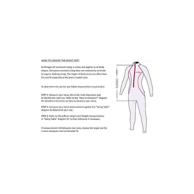 - EcoStinger swimsuits are designed to be more fitted and snug to the body which enhances the figure and provide adequate UV protection. The snug fit full body swimwear is different from regular swimwear and standard clothing sizing, we recommend choosing one size up from your regular swimwear and clothing size. For best fit please follow diagrams and sizing table images.