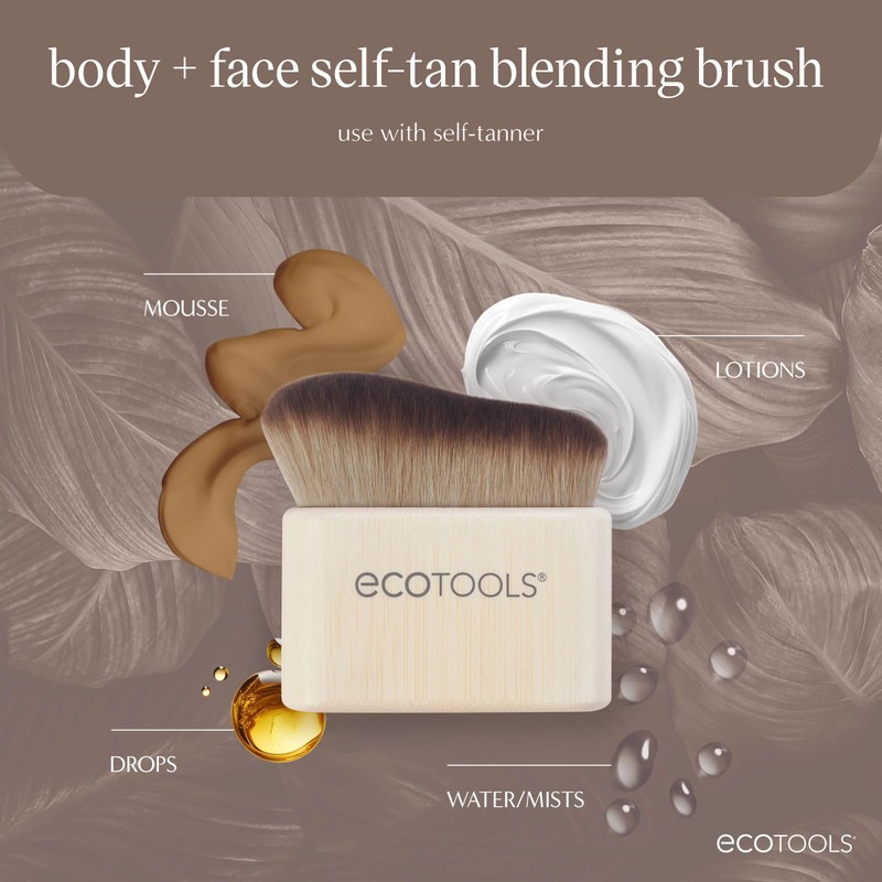 The EcoTools Good Tan collection brings you the Body + Face Self-Tan Blending Brush that's designed for streak-free self-tanner application in areas such as the hands and feet. Our tanning brush easily blends product in more difficult spots for an even, sunless tan. Use it on the knees, elbows, hands, and feet, or use it on your face for contouring with self-tanner. The blending brush can be used with mousses, lotions, waters, mists, and tanning drops. Soak up the confidence of a bronzy, natural-looking tan, ray-free. The Good Tan collection by EcoTools is safe for your skin and the planet. The Body + Face Self-Tan Blending Brush is made with synthetic hair and a 100% renewable bamboo handle. As with all our EcoTools products, it is 100% cruelty-free and vegan. EcoTools believes in taking the guesswork out of sustainability by making quality, eco-conscious personal care products accessible to everyone. We aim to create high performing, consciously crafted products that work for you, the planet, and your wallet. From exceptional makeup brushes and sponges to eco-friendly bath brushes and accessories, our products are not only sustainable and effective, but they are also always 100% vegan and cruelty-free.