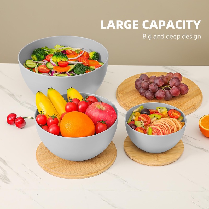 - LARGE SALAD BOWLS - Grey salad bowls set has 3 mixing bowls, 3 natural bamboo wooden lids, there are three sizes of 28 oz / 78 oz / 135 oz suitable for salads, assorted fruits, ice cream, sundaes, taco salads, pasta, sauces and other foods