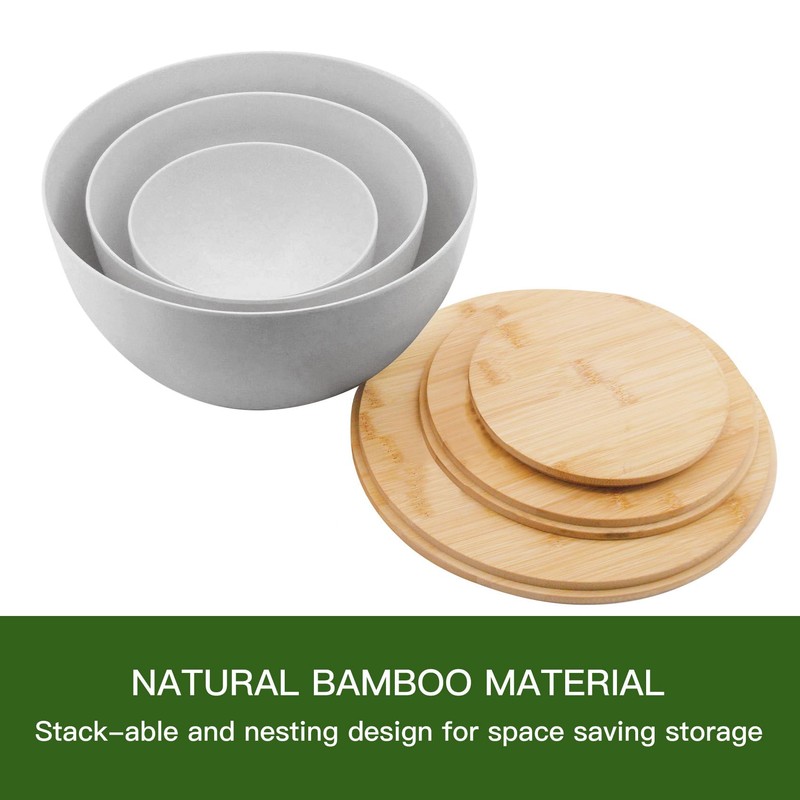 ECOWAY Salad Bowl Set of 3 with Bamboo Wooden Lids, Mixing Bowls Set, Nesting Bowls for Space Saving Storage, Made with Durable Eco-Friendly Bamboo Fiber, Great for Prepping and Serving Food, Grey