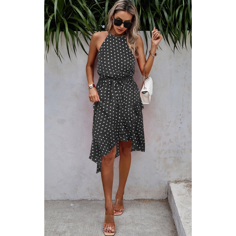 Polka Dot Halter Neck Midi Dress with Adjustable Belt and Asymmetrical Hem ? Stylish & Versatile Design: Elevate your wardrobe with this chic halter neck midi dress featuring a flattering asymmetrical hemline and a removable adjustable belt. The unique bohemian-inspired irregular hem adds movement and elegance, while the wrap-style halter neckline highlights your shoulders for a feminine, sophisticated look. Perfect for summer outings, beach vacations, weddings, or casual dates! ? Flattering Fit for All: Available in sizes XS-XL, this A-line silhouette dress drapes gracefully over curves, and the adjustable waist tie lets you customize the fit for a cinched waist or relaxed vibe. The midi length (hitting below the knee) and lightweight, breathable fabric ensure all-day comfort. ? Trendy Polka Dot Patterns: Choose from three timeless colors¡ªCoffee Brown Polka Dot (warm and earthy), Navy Blue Polka Dot (fresh and nautical), and Classic Black Polka Dot (versatile and slimming). The all-over dotted print adds playful charm to any occasion! ? Functional Details: Halter neck with back tie closure for adjustable support Sleeveless design keeps you cool in warm weather Flowery irregular hem creates visual interest Hidden side zipper for easy wear Perfect For: Beach weddings, garden parties, vacations, brunch dates, or pairing with sandals, wedges, or denim jackets for a casual look. Machine-washable fabric retains softness and vibrant colors. Category: Polka dot midi dress, halter neck summer dress, asymmetrical hem dress, adjustable belt dress, boho beach wedding guest dress, wrap v neck dress, women's casual party dress, floral print maxi dress, summer flowy dress, trendy vacation outfits Style Tip: Layer with a cropped cardigan for cooler evenings or accessorize with straw hats and statement earrings for a boho-chic vibe!