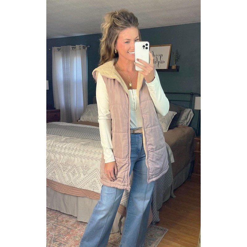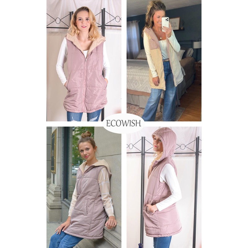 ECOWISH Women Long Puffer Vest: Fall Zipper Reversible Fleece Jacket Sleeveless Hooded Outerwear Vest Bean Paste Pink Small