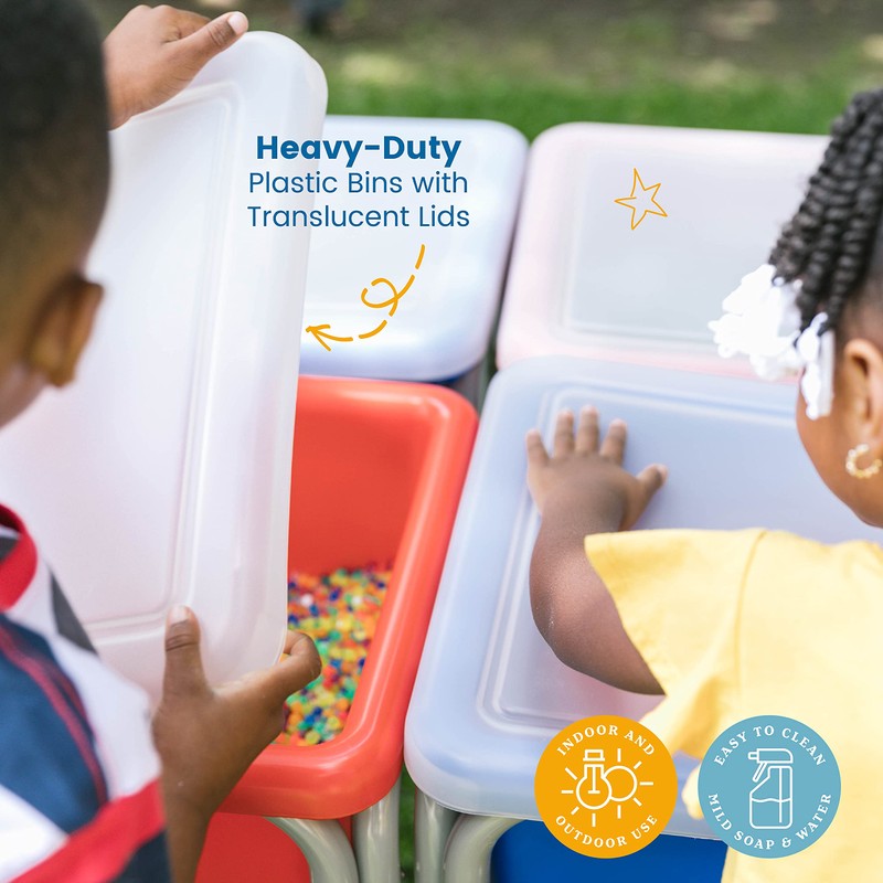 - Indoors and Outdoors: Play tables can be used in the backyard, outdoor play area, classroom, playroom; cover basins with secure lids to keep contents dry; bring tables inside to prevent rust