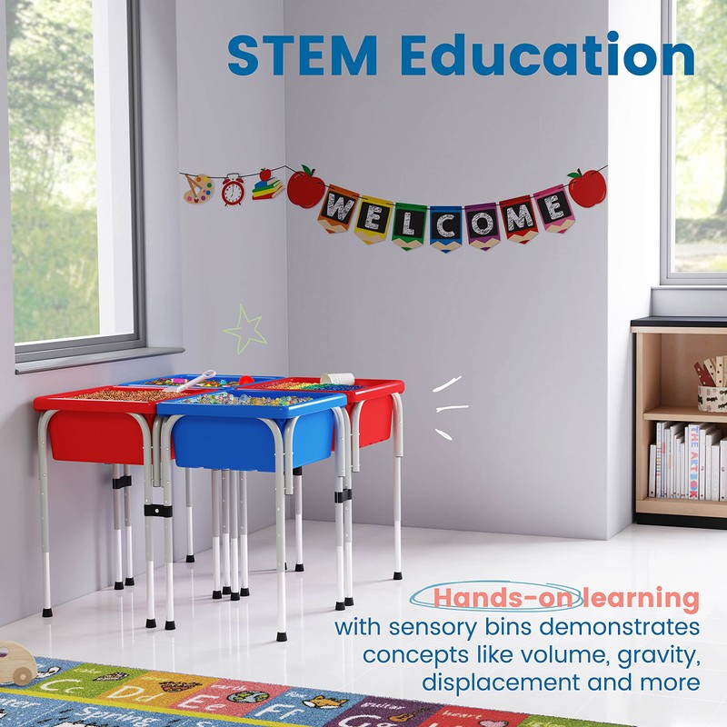 - Sensory Activity Table: Four basins provide a place for children to engage in sensory play with sand, water, toys, water beads, shaving cream and more for sensory stimulation including touch and sight