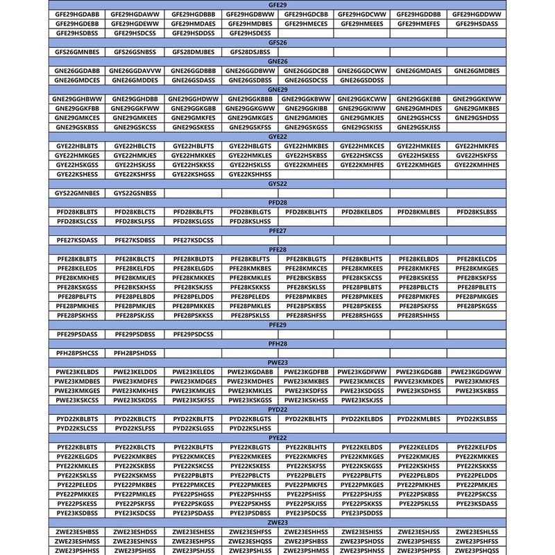CFE28TP2MBS1, CFE28USHNSS, CWE23SP2MBS1, CYE22TP2MBS1, DFE28JELCDS, GFD28GBLBTS, GFE26GGHEBB, PFE28KELFDS, PWE23KSKDSS, PYE22KSKBSS, GYE22HMKEES, etc.