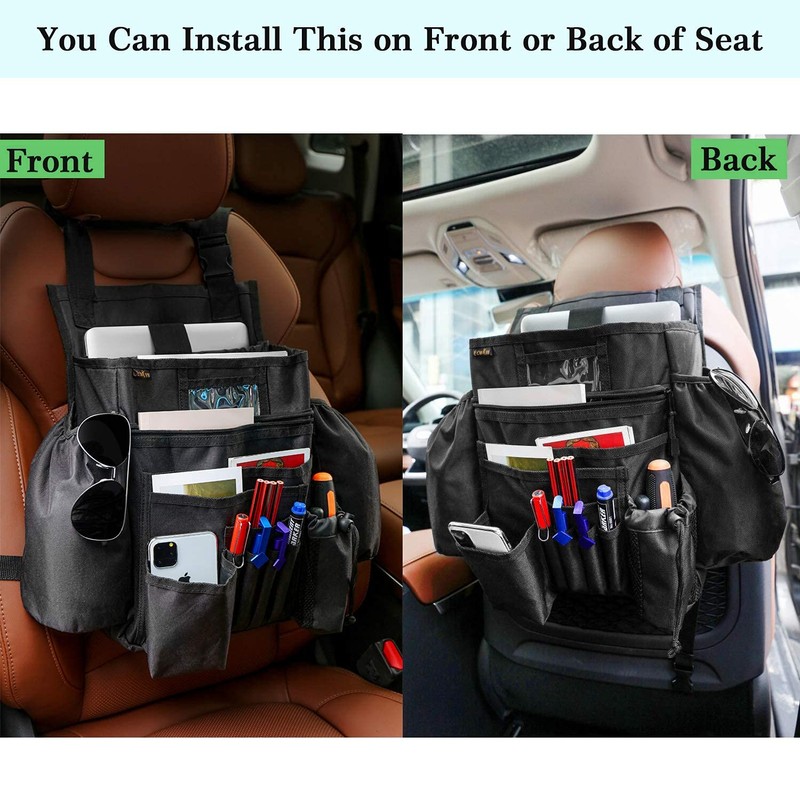 - UNIVERSAL FOR ALL CARS, SUV, TRUCKS: this car seat storage is designed with stabilizing side straps, soft adjustable shoulder strap and hardened buckles, make more stable AROUND ANY HEADREST. Also conveniently convert to a car back seat organizer as you preferred.