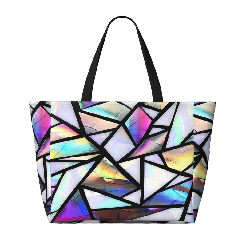 Edafol Geometric Iridescent Triangles Print Beach Bag Large Waterproof Sandproof Tote Bag Women Zipper Travel Beach Bags Swim Pool Gym Shopping Grocery Handbag