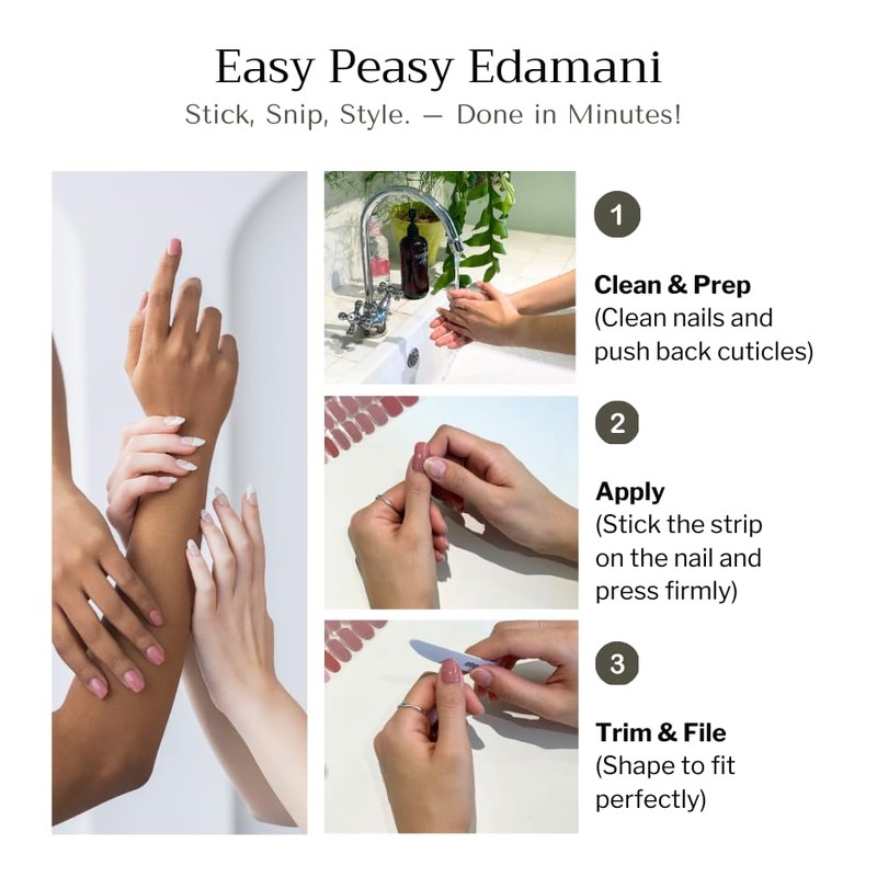 - 🔹 FAST, EASY DIY MANICURE – NO WAIT, NO SKILLS NEEDED! Peel, press, and go! Get a pro-level manicure in minutes—no drying time, no mess and no skills required. Whether you're a busy professional, a multitasking mom, or a beauty lover on the go, edamani gel strips make effortless beauty a reality.