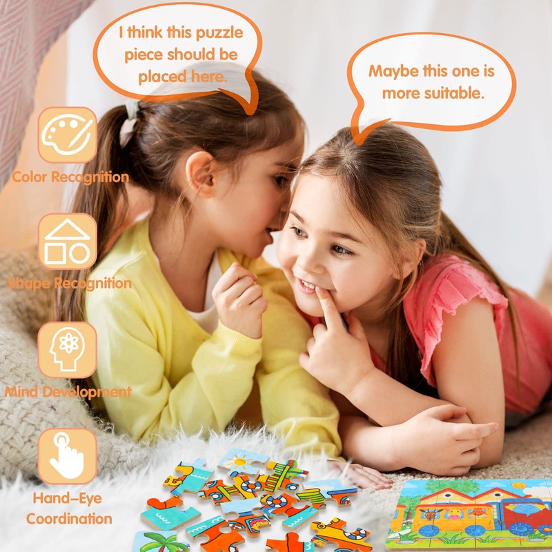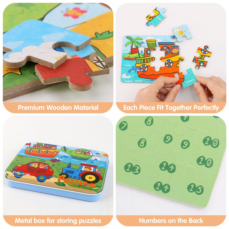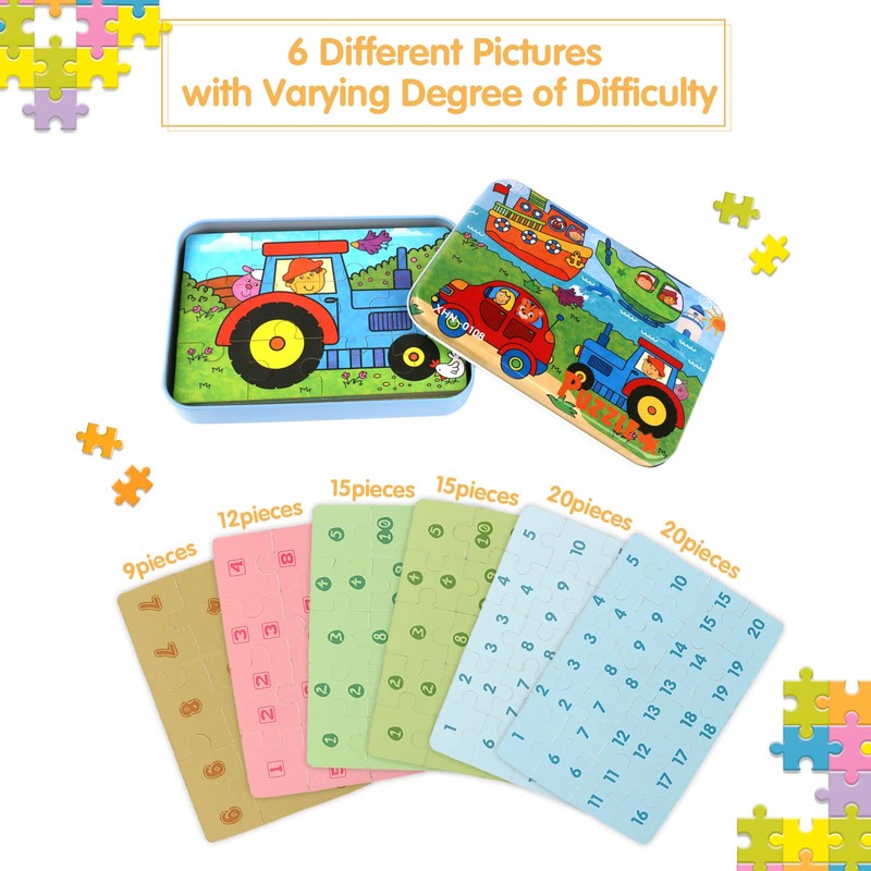 - Kids Puzzles Set: There are 9 + 12 + 15 + 20 +15 +20 a total of 6 sheets puzzles with 91 pieces, and the difficulty is gradually increasing. The kid's puzzles set includes 6 different pictures about traffic.