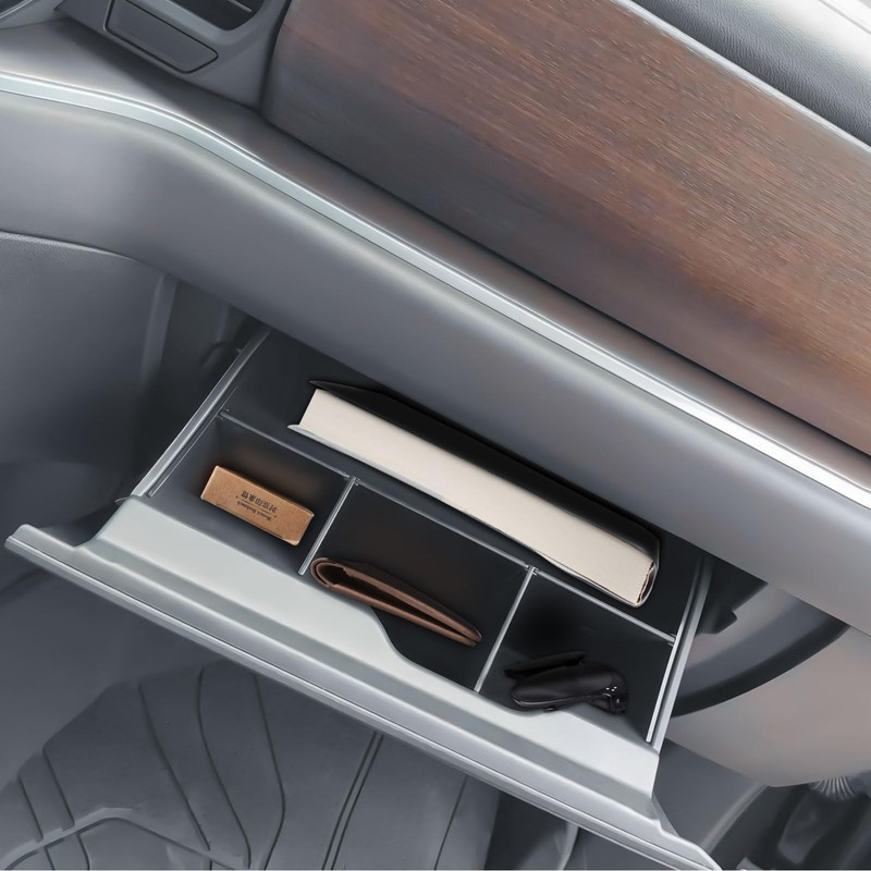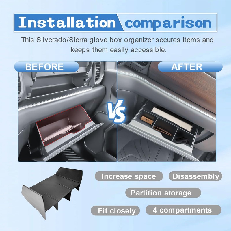 - Patent Design: Turn the Silverado/Sierra glove box into 4 compartments for you to organize items according to your needs such as the owner’s manual, pens, cables, notepads. The large size compartment can fit the owner’s manual