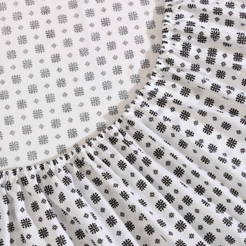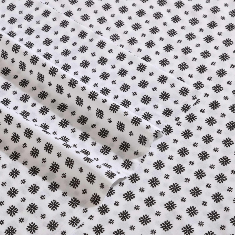 - FEATURES: This Eddie Bauer Fairisle Sprinkle sheet set features a black pattern on a white ground. Crafted with crisp and breathable cotton, each piece in this set boasts a matching pattern for a unified look that complements your decor's color palette. The Eddie Bauer T200 Sheet Sets coordinate beautifully with any Eddie Bauer Bedding Set.
