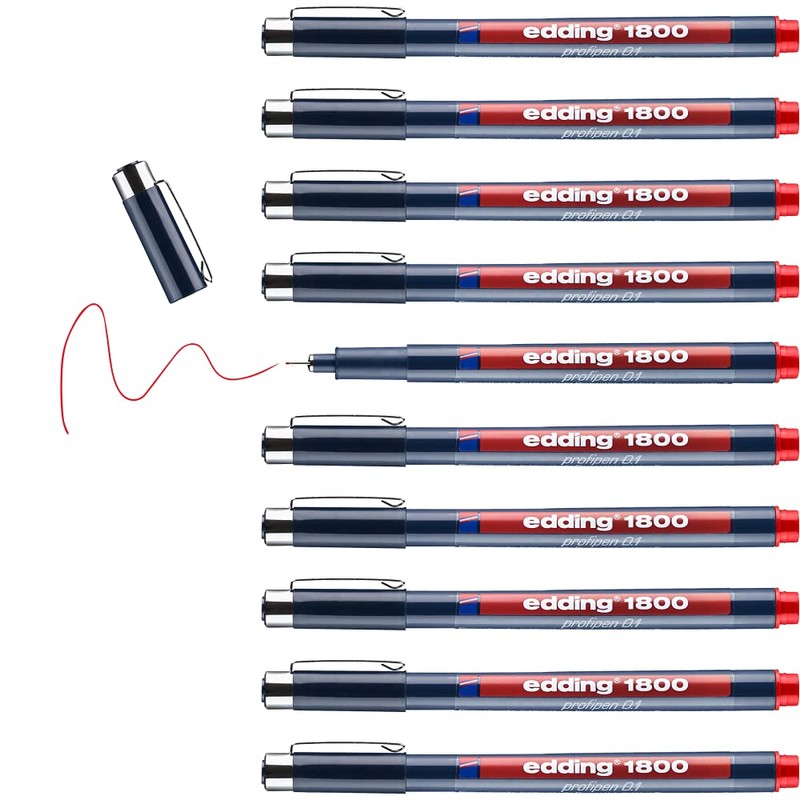 edding 1800 profipen - red - 10 pens - line width 0.25 mm - fineliner pen for precise writing, sketching and technical drawing - fine, metal-encased nib - suitable for use with rulers and stencils