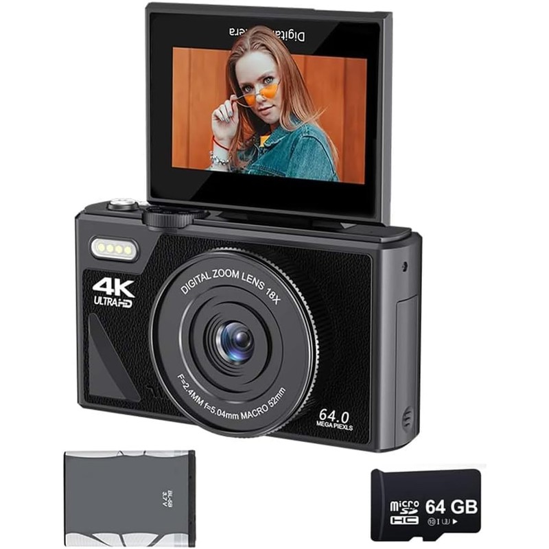 eDealz 4K 64MP Digital Camera for Photography, Vlogging Camera for YouTube with 3.0’’ 180° Flip Screen, 18X Digital Zoom, Rechargeable Battery, 64GB Micro SD Card, Black, 64MPBLK, MF64MP4K_VAR