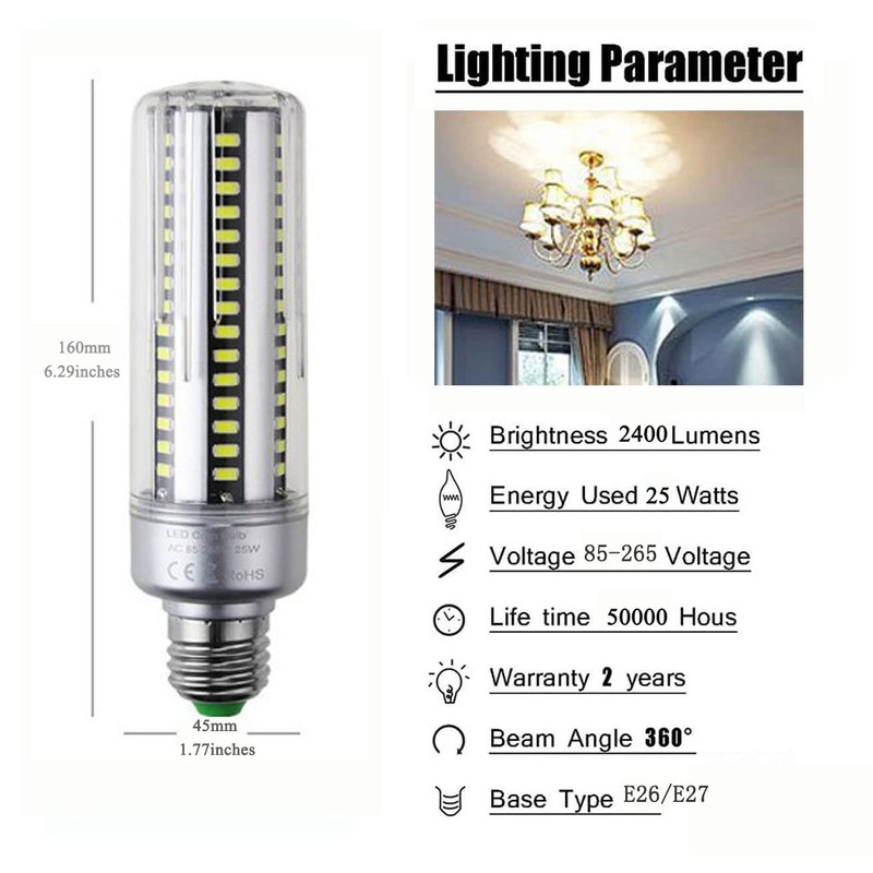 - SPECIFIATION , 4pcs 45mm*160mm/1.77inch*6.29inch, 25W E26 Standard Base LED Corn Light Bulbs, Daylight White 6000K lighting to fit for indoor and outdoor use and output high brightness of 2400LM, AC85-265(V), 360°Beam Angle, Efficient housing design results in 95% light utilization , CRI 80+ , Non-dimmable