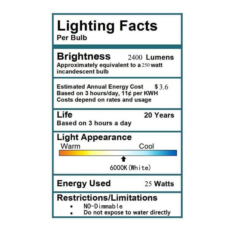 - ENERGY SAVING , The 25W LED corn light bulbs designed with overload protection, short circuit protection, over temperature protection and save over 90% on electricity bill of lighting less energy than traditional incandescent lamp, 25W (250 watt Equivalent) , 50,000 hours lifespan that you don't need to change the bulb frequently , reduced average household energy costs to only $3.6 per year(Based on 3 hrs usage for each day) , help you saving electricity and money