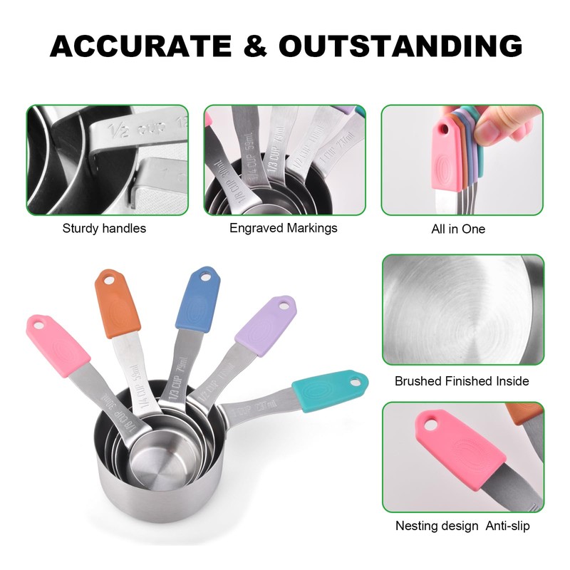 • Nonslip Measuring Cups Handles - These stainless steel measuring cups are designed with nonslip silicone handles for those wet or greasy hands.