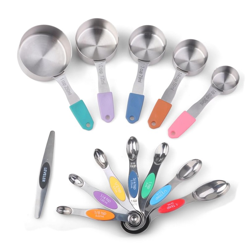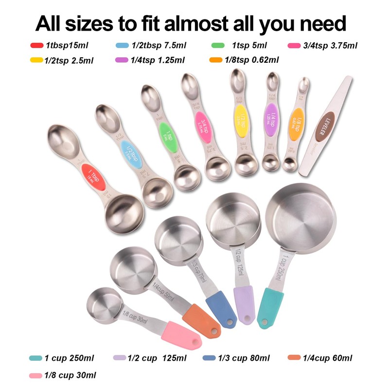 • Comprehensive Set: Includes 5 magnetic measuring cups (1/4, 1/3, 1/2, 2/3, and 1 cup) and 7 magnetic measuring spoons (1/8, 1/4, 1/2, 3/4, 1 tsp, 1/2 tbsp, and 1 tbsp) plus a leveler.Precise quantity of ingredients is what you need to get great results with cooking and baking. You can also make tasty recipes to help you lose weight with these amazing spoons.
