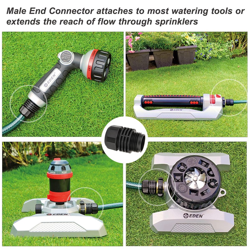 - The hose can be used in several ways: 1) Extend the reach of the Eden flex design set (model #97063, #97065) or multi-adjustable spike sprinkler (model #96093) up to 50 ft. 2) Connect with Eden shower nozzle or other watering tools such as oscillating sprinklers, spray nozzles, watering wands, rotary sprinklers, etc.