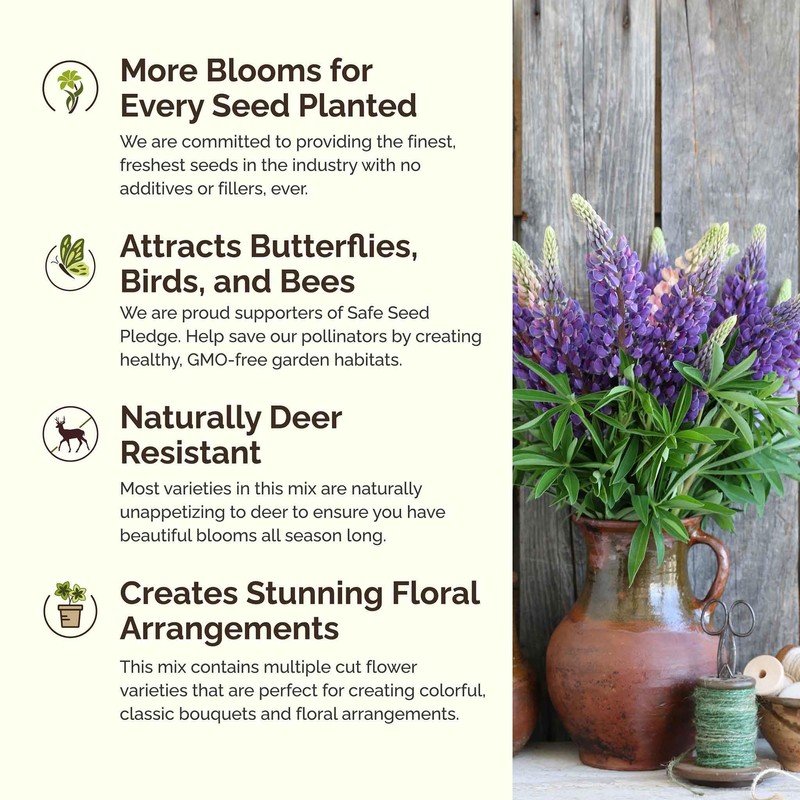 - 100% Pure, Non-GMO Seeds - No fillers, favorites only! Includes 24 easy-to-grow species: Cornflower Dwarf Blue, Birds Eyes, Clarkia, African Daisy, Arroyo Lupine, Chinese Houses, Cornflower Tall Blue, Lance Leaf Coreopsis, Wild Cosmos, Blanket Flower, Black Eyed Susan, Wild Perennial Lupine, Purple Coneflower, Russell Lupine, Plains Coreopsis, Siberian Wallflower, Blue Flax, Scarlet Flax, Annual Red Phlox, Bright Lights Cosmos, Gloriosa Daisy