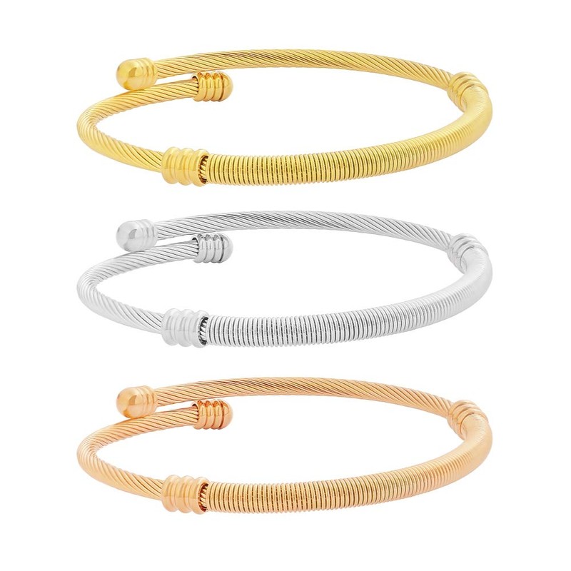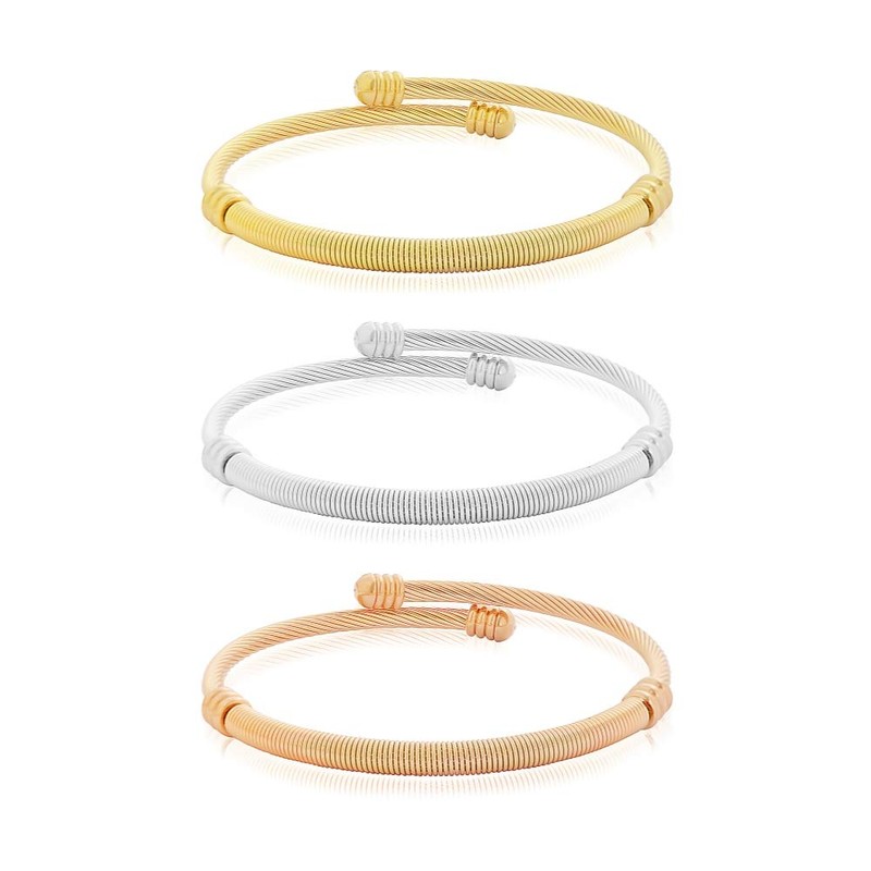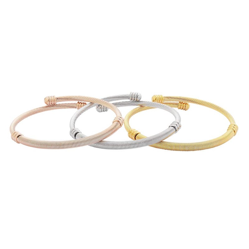 EDFORCE 3 Tone Stainless Steel Hypoallergenic Stacked Twisted Cable Wire Bangle Adjustable Cuff Bracelet Set, Set of 3, 6"-7.5" (Wire)