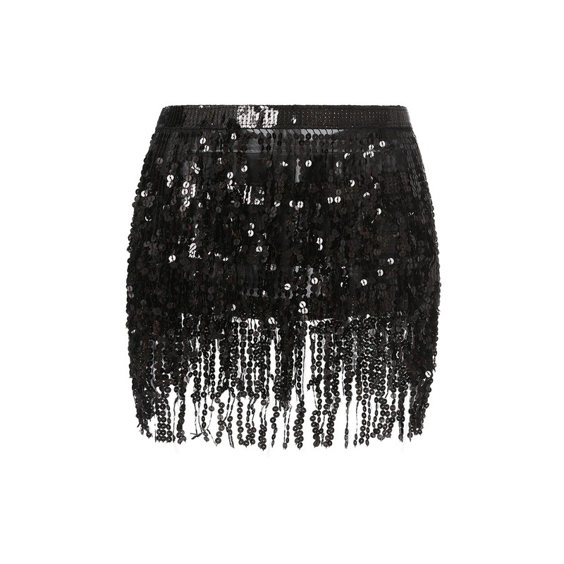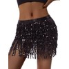 Edhomenn Women's Sequin Tassel Mini Skirt Low Waist Short Skirt Fringe Belly Dance Skirt (Black, ONE Size)