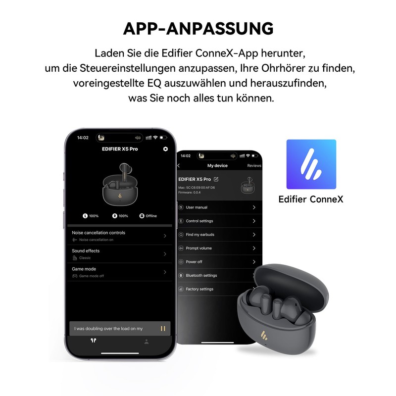 - App adjustment: Download the Edifier ConneX app to unlock all functions, such as such as adjusting control settings, searching for your earplugs, selecting preset EQs and enjoying your music your way.