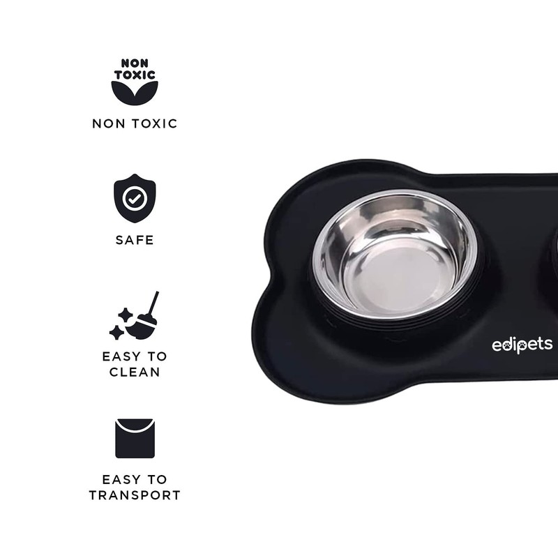 Edipets, Futternapf für Hund Katzen und Haustiere, Trinker für Hund Katzen, Doppelteller aus Edelstahl, rutschfeste Silikonbasis (Schwarz)