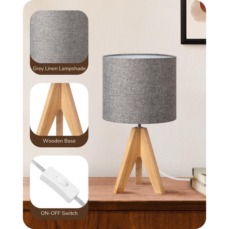 EDISHINE EDISHINE 36cm Wood Bedside Table Lamp, Tripod Desk Lamp with Grey Linen Lampshade, On-Off Switch, Desk Lamps for Reading, Bedroom, Living Room, Study, Office, E27 Base