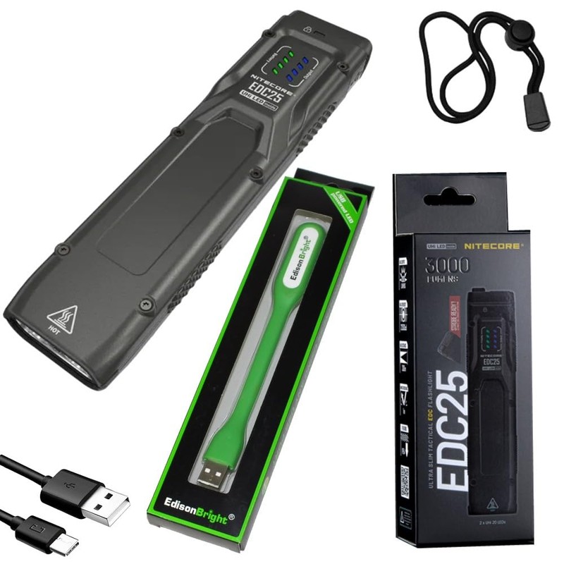 MODE OUTPUTTurbo 3000 lumensHigh 1000 lumensMid 200 lumensLow 65 lumensUltralow 15 lumensStrobe 3000 lumensOutrageous beam intensity of 22,500cd gives you over 900ft of throw - incredible for an EDCPocket clip includes a loop that fits 550 paracord, allowing you to make a customizable lanyard1700mAh battery provides up to 55 hours of runtime5 brightness modes plus StrobeIncludes both battery and brightness level indicatorsUSB-C rechargeable for easy chargingCustomizable Turbo and Strobe mode2 lockout modes protect against accidental activationMemorization function remembers your last-used brightness levelAdvanced Power Cut-Off (APC) and Advanced Temperature Regulation (ATR) technologies monitor power consumption and temperature to keep your light healthy and safe to useInternal USB-C charging makes it easy to keep EDC25 poweredIncluded in the boxNitecore EDC25LanyardUSB-C Charging CableBundle includes EdisonBright brand USB powered reading light