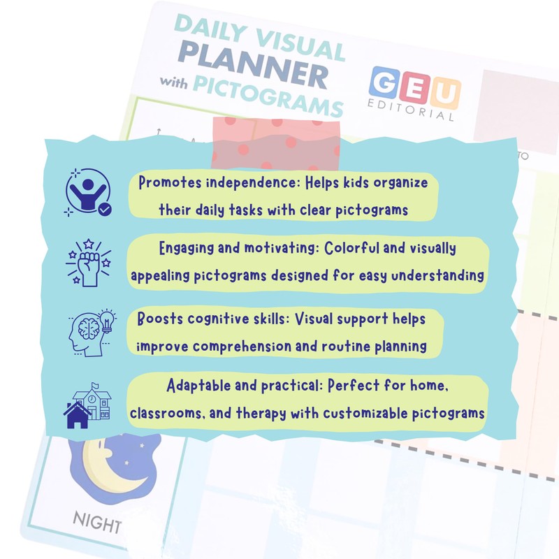 CARDS WITH PICTOGRAMS INCLUDED: Each planner comes with a complete set of cards with colorful and easy to follow pictograms.