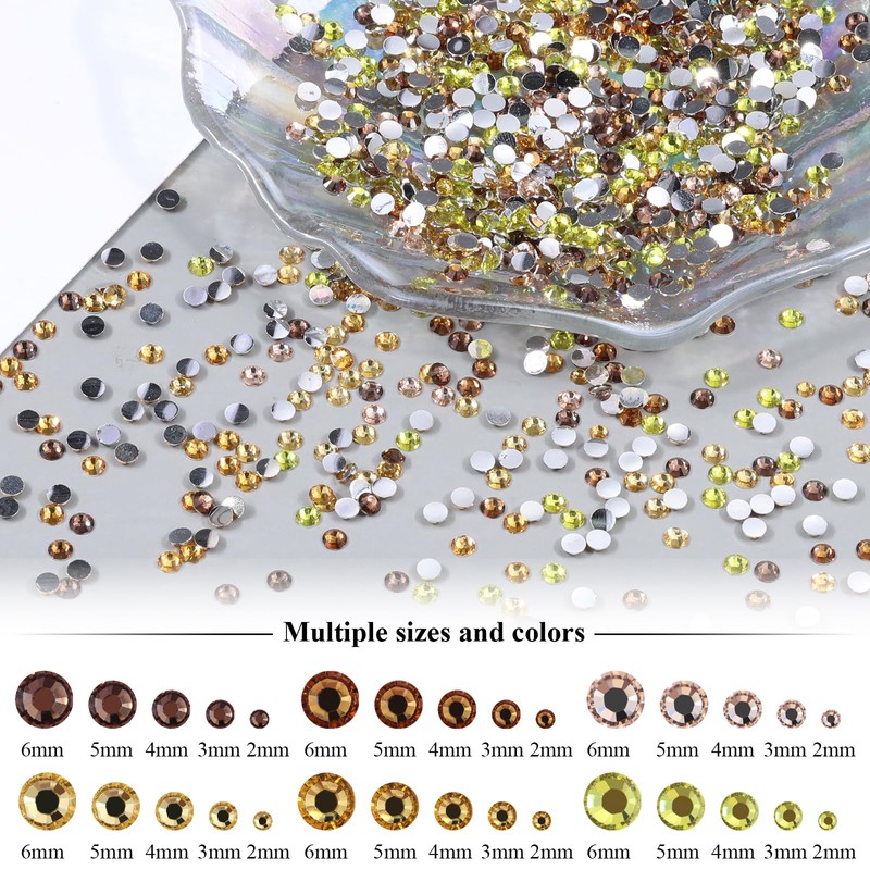 - Assorted flatback sizes: There are 6 colors in total, and each color has 5 sizes: diameter 2mm(1000 Pieces), 3mm(580 Pieces), 4mm(280 Pieces), 5mm(160 Pieces), 6mm(50 Pieces). 2070 pieces per color, 12420 pieces in total.