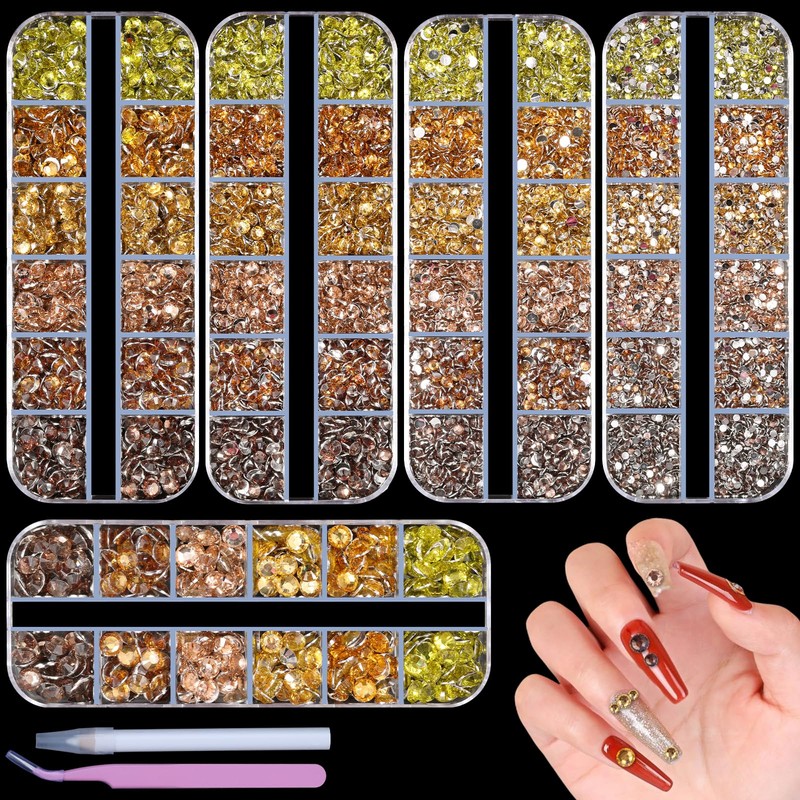 editTime nail rhinestones kit comes with 5 boxes 12780 pieces various nail rhinestones, a tweezers and a pencil.