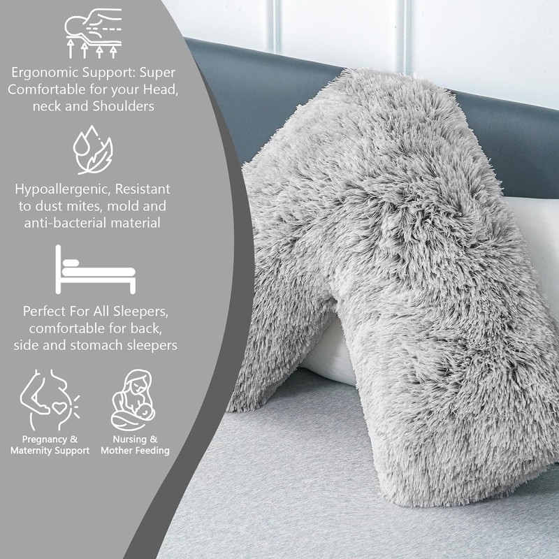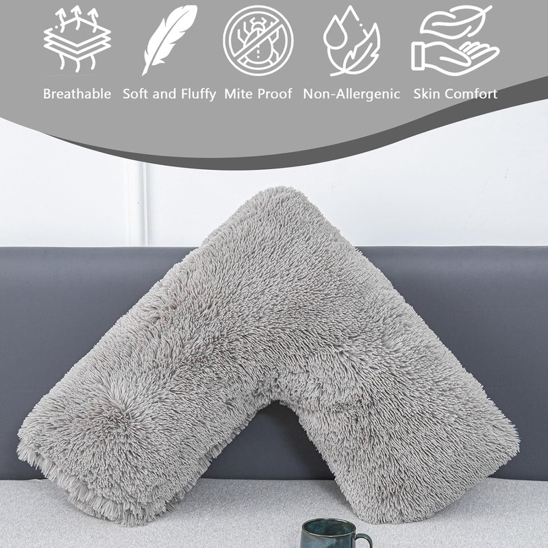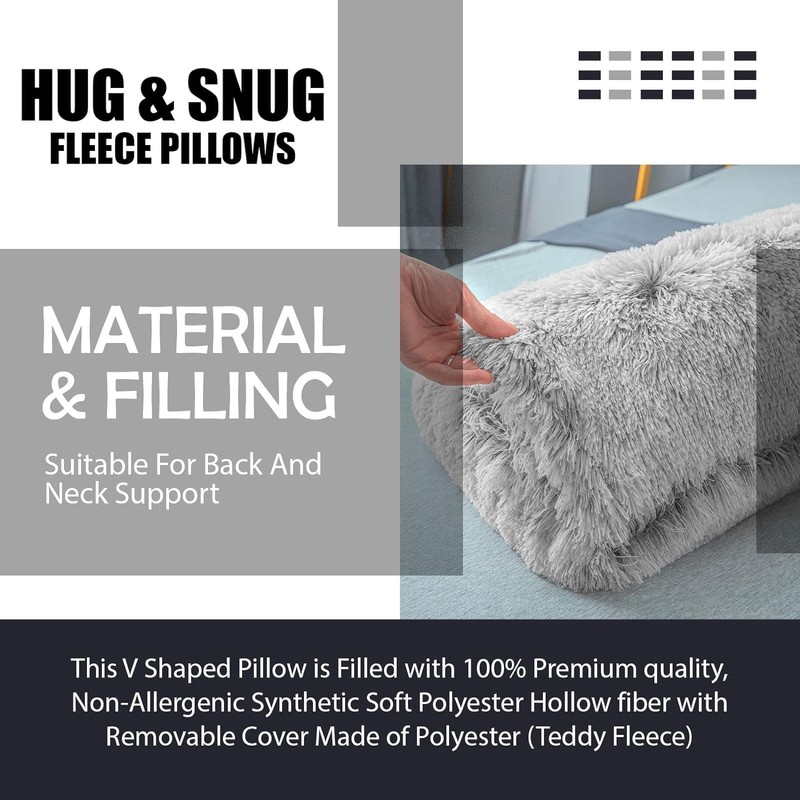 - V Pillow with Teddy Fleece Cover: Includes: 1 x V-shaped pillow & 1 x Teddy Fleece Cover made from soft teddy fleece material. Teddy fleece's luxurious texture not only caresses your skin but also retains warmth, ensuring you stay snug during chilly nights. V-shape pillows have a unique, elongated shape resembling the letter "V." This shape allows them to provide support to multiple areas of the body simultaneously.