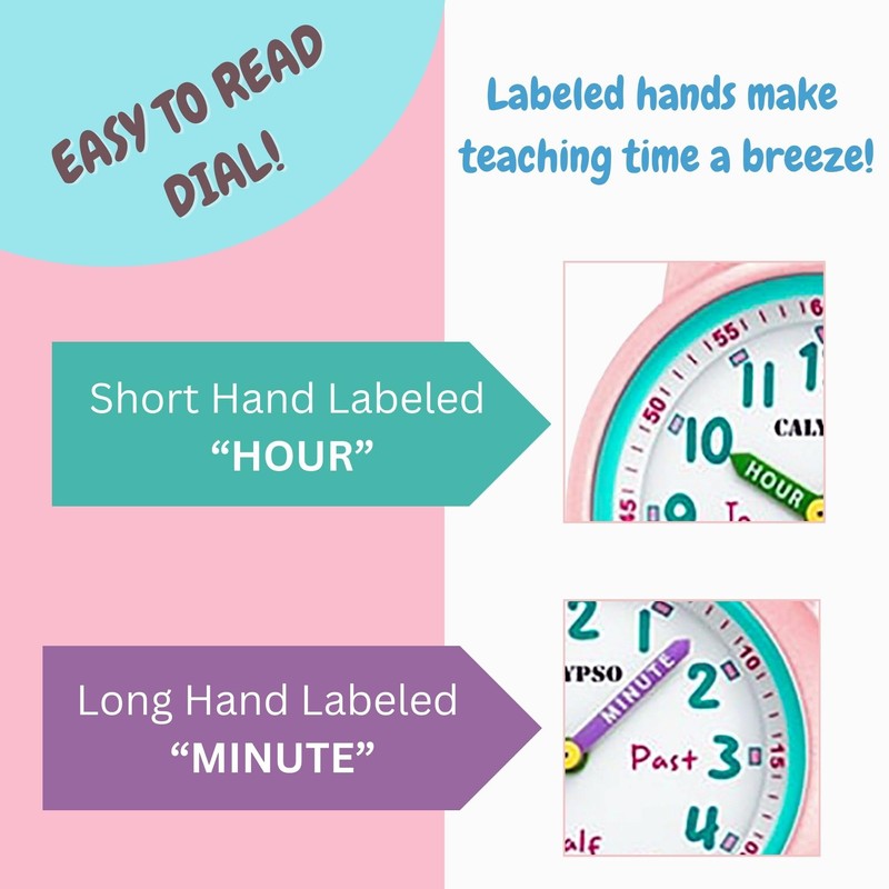 - Educational Time Teacher Watch: Easy To Read Dial Has Big Numbers And Dial Hands That Are Labeled With "Hour" And "Minute". Dial Also Has A Minute Track To Make It Easier To Teach Your Kids For To Tell Time.