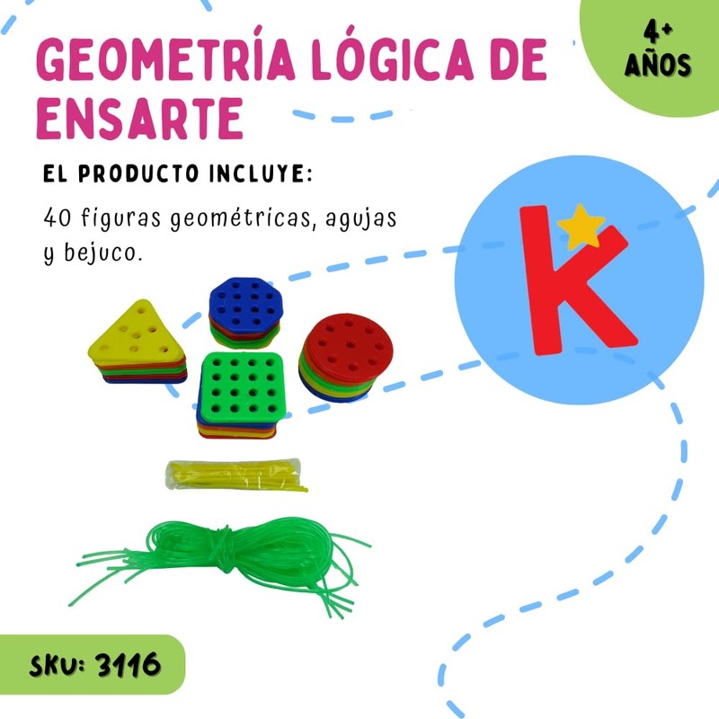 Contenido: - 10 cuadrados - 10 círculos - 10 triángulos -10 octágonos. - 15 agujas de plástico. Las figuras geométricas vienen en diferentes colores como: azul, amarillo, verde, naranja y rojo. Jugar con figuras geométricas de ensarte puede contribuir al desarrollo de varias habilidades en los niños, entre las que se incluyen: Coordinación motora fina: Al ensartar las figuras en los agujeros o pinchos, los niños practican la coordinación mano-ojo y desarrollan destrezas motoras finas. Reconocimiento de formas y colores: Al manipular diferentes figuras geométricas, los niños aprenden a reconocer y distinguir formas y colores. Resolución de problemas: Al intentar encajar las figuras en los lugares correctos, los niños desarrollan habilidades de resolución de problemas y pensamiento espacial. En Edudak somos fabricantes de juguetes didácticos.