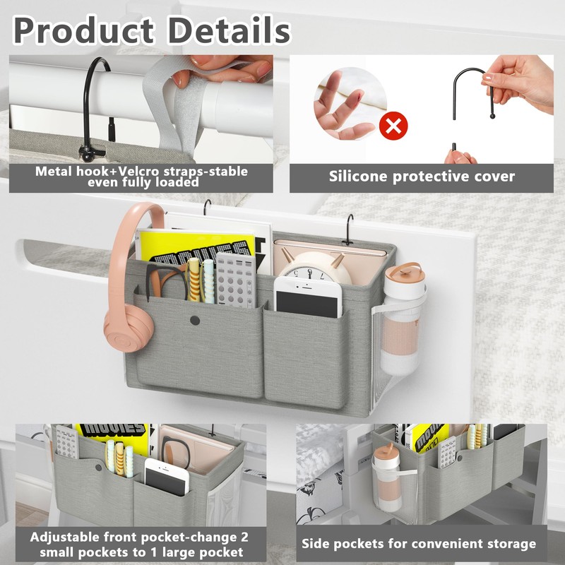 • Superior Bearing Capacity: The bed pockets bedside storage with sturdy metal hooks and adjustable straps, can bear heavy items without compromising stability, making it the ideal hanging bedside caddy for your bed storage needs.