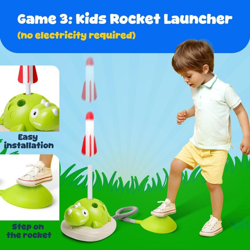 Edulok 3-in-1 Remote Control Dinosaur Play Set - Musical Bouncing Game with Ring Toss & Rocket Launcher, Indoor/Outdoor Active Play for Ages 3+