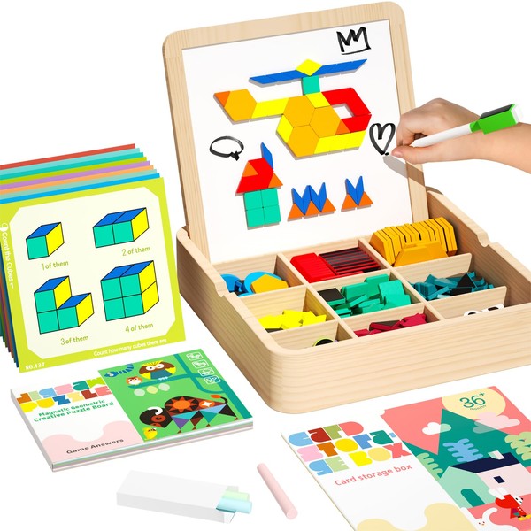 - Creative Magnetic Puzzle: This magnetic pattern block set includes 248 pcs magnetic puzzles, a drawing pen, a box of chalk for doodling on the back of the board, a 28-page manual, and 146 cards featuring over 280 patterns and design challenges. This combination of activities sparks creativity and provides endless opportunities for artistic expression, making it the perfect educational toy for toddlers aged 3-5.
