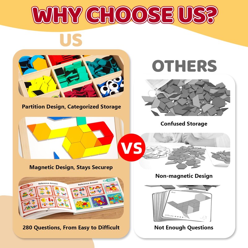 - Safe & Durable: The tangrams are made from high-quality wood, the puzzle blocks feature smooth, rounded edges, ensuring safe play for kids aged 4-8. The durable materials and vibrant colors not only make the set visually appealing but also guarantee long-lasting use.