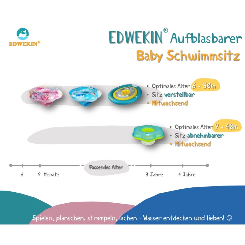 - ✔ FROM PARENTS FOR PARENTS: Only the best suitable baby swimming float for the respective age and use. EDWEKIN's baby float development is based on continuous optimisation by designers and engineers as well as on the experience of numerous parents.