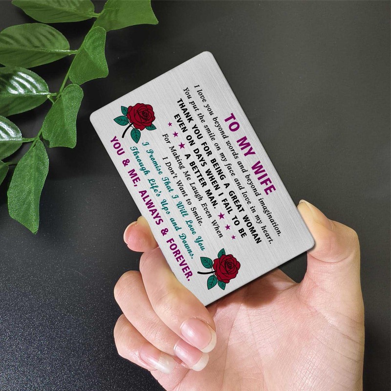 - Material - The wife card is made of high-quality stainless steel, permanent laser engraved. Stainless steel is hypoallergenic, it also doesn't rust.