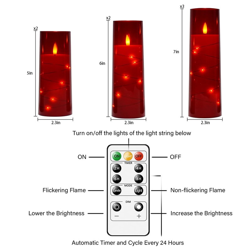 • Simple remote control timing function: You can use the remote control to control the candle even if placed far away. Setting a 2H/4H/6H/8H timer saves you one step from turning them on/off, as they will light up automatically at the same time every day.