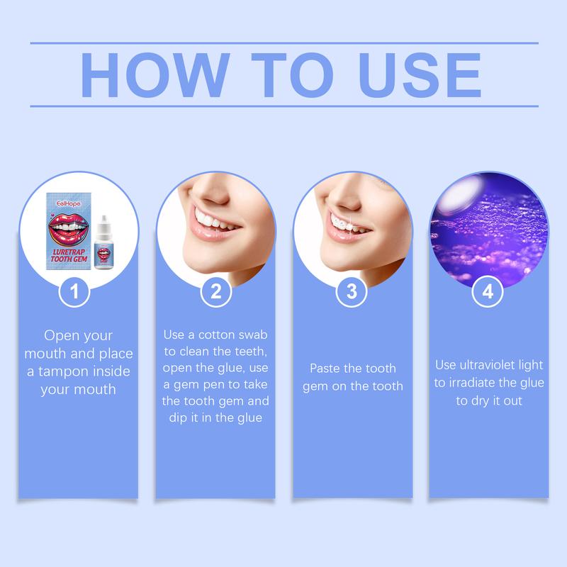 Our dental beauty kits contain acrylic, acrylic and methacrylate. It can cure glue quickly. Diverse selection of gemstones, personalized tooth decoration. The glue is durable and stable, and the decorative effect is lasting. Its use is simple: 1. Open your mouth and put a tampon in your mouth; 2. Clean your teeth with cotton swabs. Open the glue, use the gem pen to remove the tooth gem, dip in the glue; 3. Stick gems on your teeth; 4. Dry the glue with ultraviolet light. Material safety, no harm to the body, create a confident smile with peace of mind. Meet the decoration needs of fast pace life. Be creative and make your smile unique.