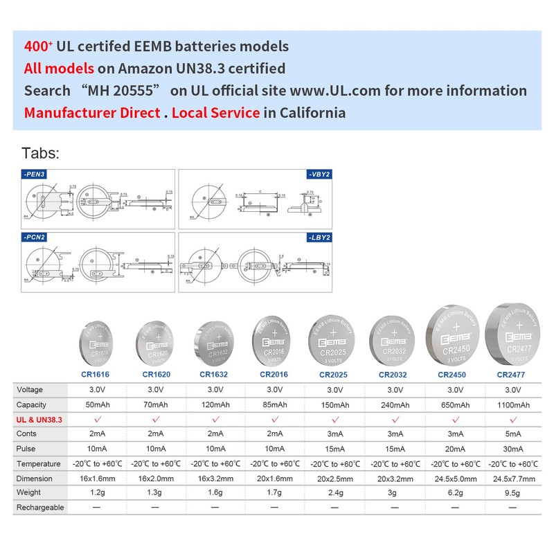 - ▷CERTIFICATIONS—This is not a rechargeable battery. DO NOT Charge battery. UN 38.3 compliant. More than 400 EEMB battery models are UL certified. Search "MH20555" on UL for all EEMB UL certification information.